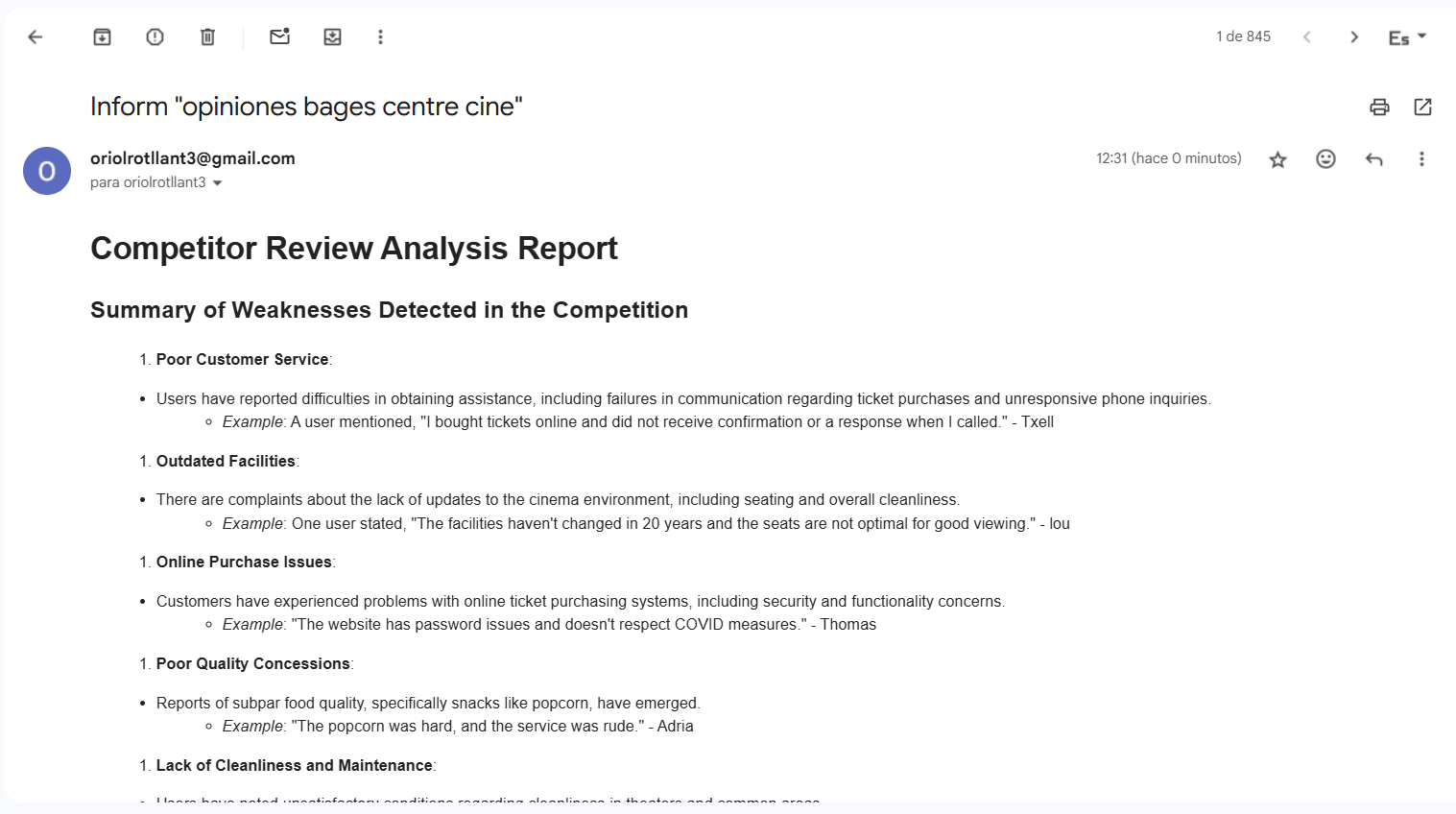 This workflow is designed for professionals, companies, and agencies that want to automate competitive analysis based on public reviews and opinions found on the Internet. It is especially useful for: